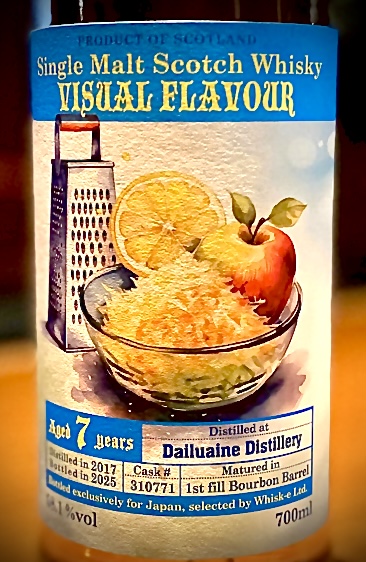 ヴィジュアルフレーバーから久々に出た1本。今回はダルユーインの2017年・7年もので、ファーストフィルバーボンバレルのシングルカスク・カスクストレングス。本品を象徴するフレーバーは「すりおろしリンゴとレモン」でラベルデザインに描かれています。(2025.12.03)